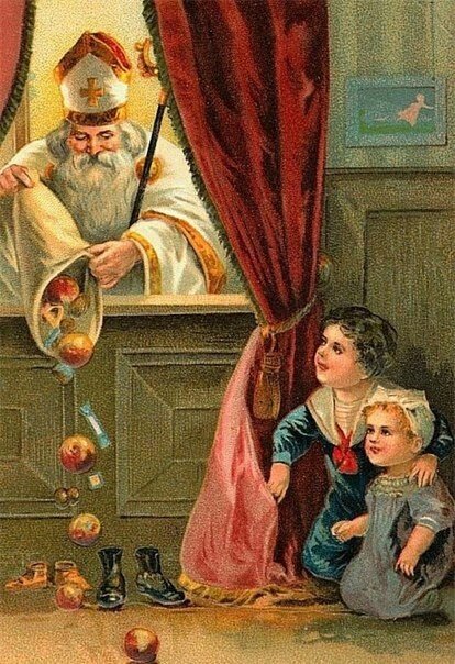 Изначально именно от имени Святителя Николая малышам дарили подарки в день Николы зимнего. Потом дату перенесли поближе к Рождеству — 24 декабря. А один из рассказов о чудесах святого рассказывает о том, как он спас от бедности старика и трех его дочерей, которых тот едва не отправил зарабатывать на жизнь блудом. Трижды Святитель Николай приходил ночью к его дому и подбрасывал в его окно кошельки с золотыми монетами, а по другим версиям — высыпал деньги в обувь на пороге дома или даже бросал в трубу дома (после чего монетки попадали в носки, сушащиеся над камином). Таким же образом он помог многим нищим. Так появилась традиция класть подарки для детишек в башмачки под елкой или в носки у камина. Вскоре в разных странах образ Николая Угодника претерпел изменения и обрел новые имена, но внешность зимнего волшебника, дарителя подарков, менялась мало (статный добрый старец с длинной густой бородой), а в именах зачастую схожи по звучанию со Святым Николаем.