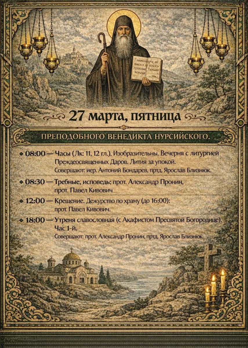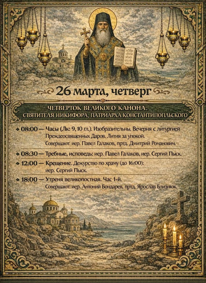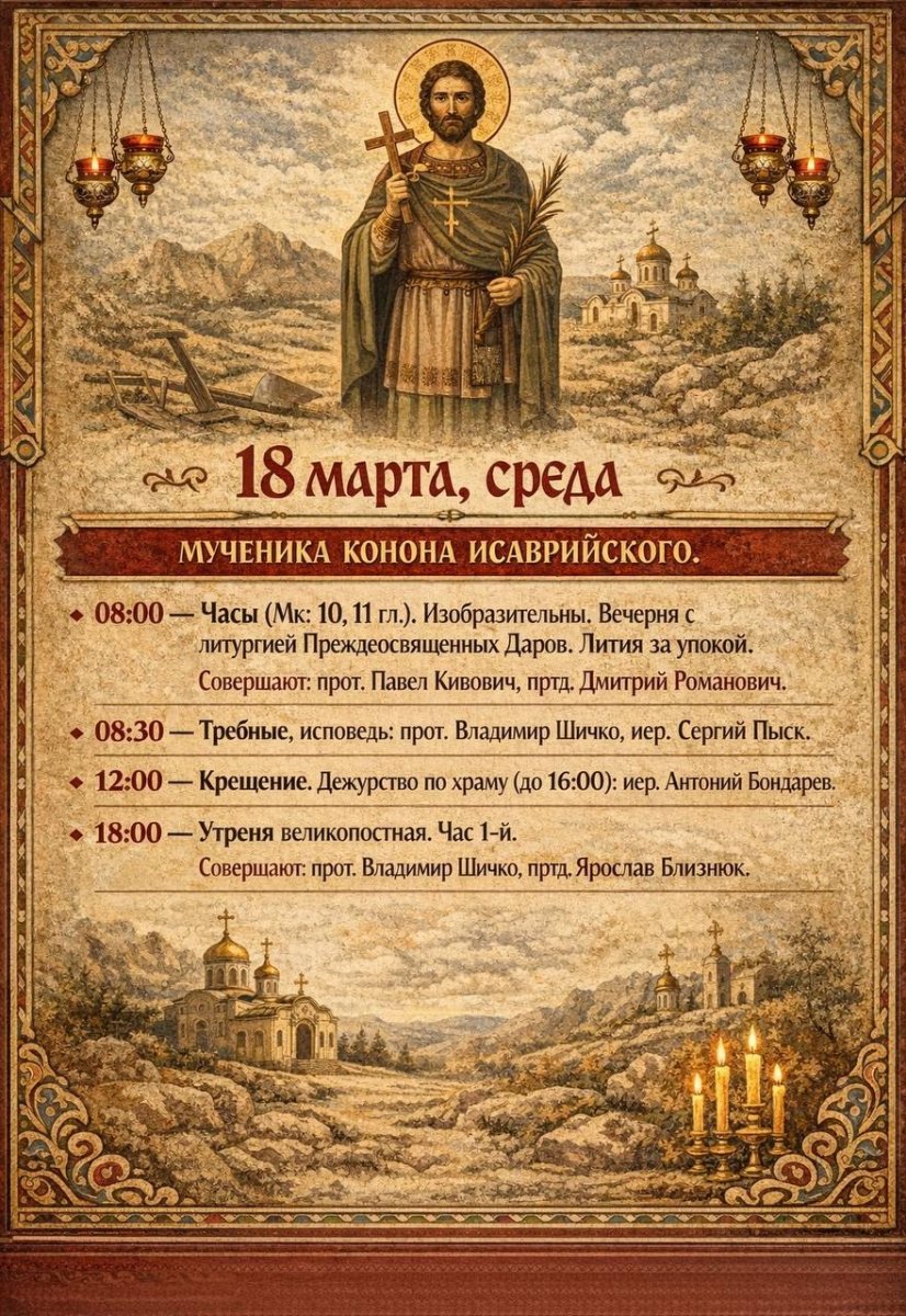8:00 Часы с чтением Евангелия. Лития за упокой. Изобразительны Вечерня с литургией Преждеосвященных Даров 8:30 Исповедь 18:00 Утреня великопостная. Час 1-й