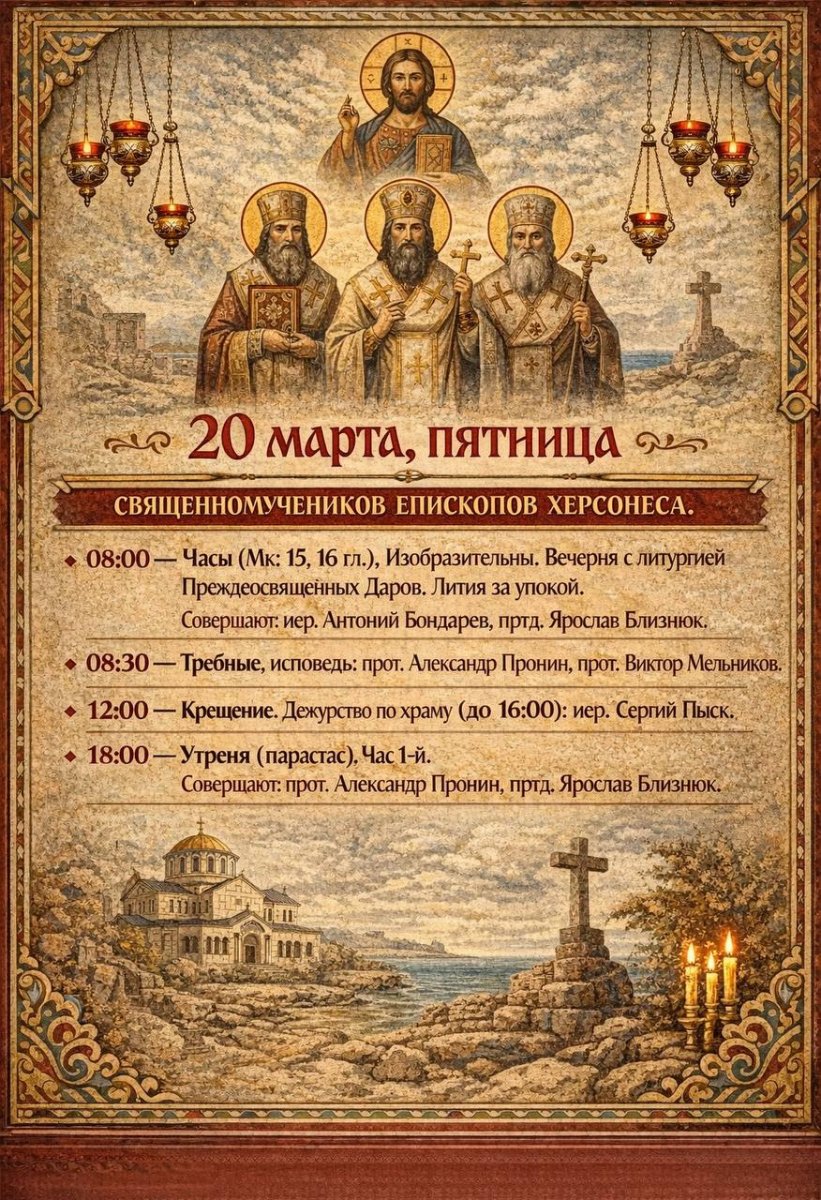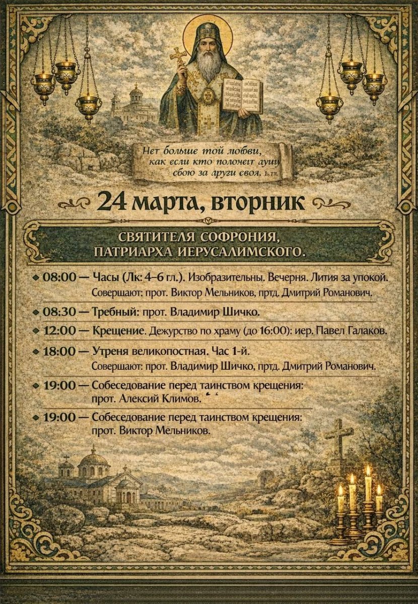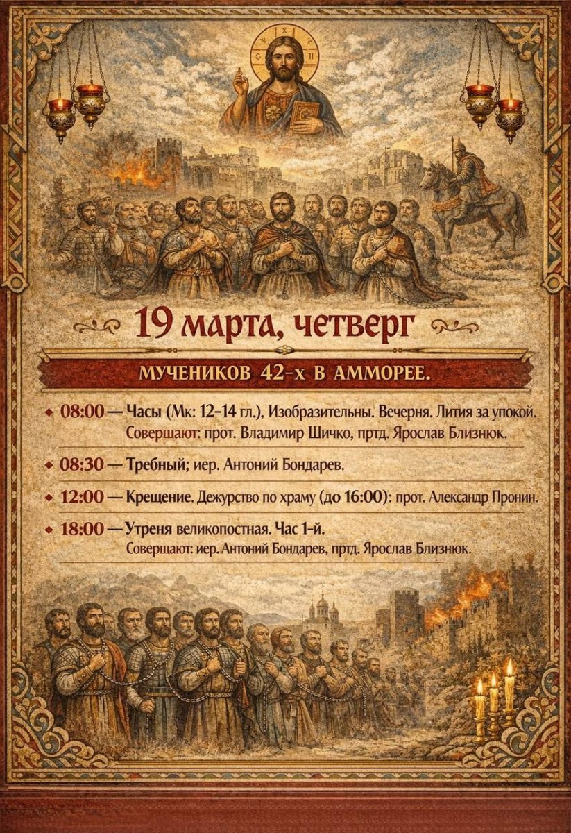 8:00 Часы с чтением Евангелия. Изобразительны. Вечерня. Лития за упокой 12:00 Крещение 18:00 Таинство Елеосвящения (Соборование)