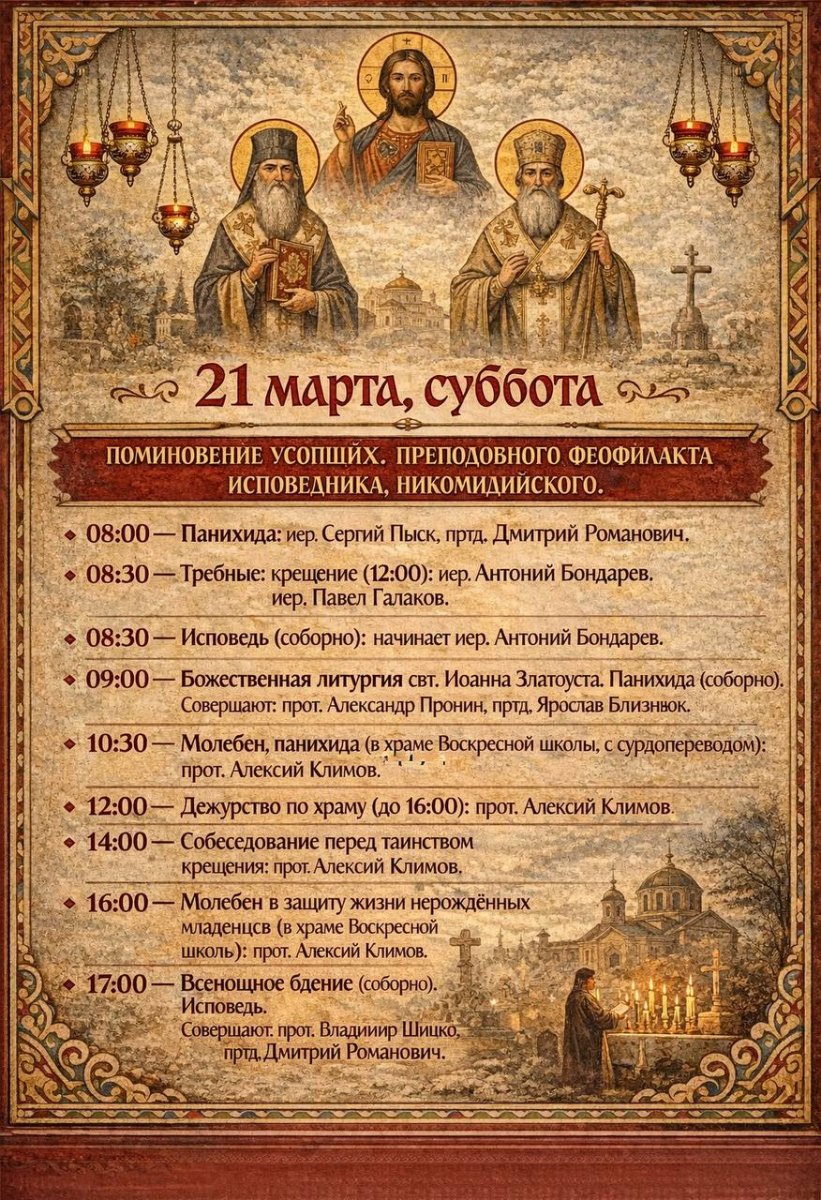 8:00 Панихида 8:30 Исповедь 8:40 Часы 3-й, 6-й 9:00 Божественная литургия свт. Иоанна Златоуста. Панихида 10:30 Молебен, панихида (в храме Воскресной школы, с сурдопереводом) 12:00 Крещение 17:00 Всенощное бдение. Исповедь