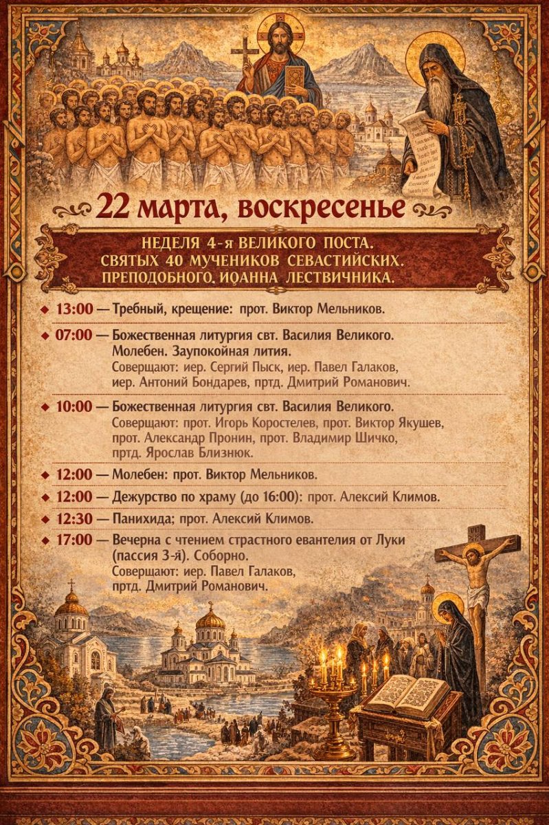 НЕДЕЛЯ 4-я ВЕЛИКОГО ПОСТА. СВЯТЫХ 40 МУЧЕНИКОВ СЕВАСТИЙСКИХ. ВОСКРЕСЕНЬЕ ПРЕПОДОБНОГО ИОАННА ЛЕСТВИЧНИКА