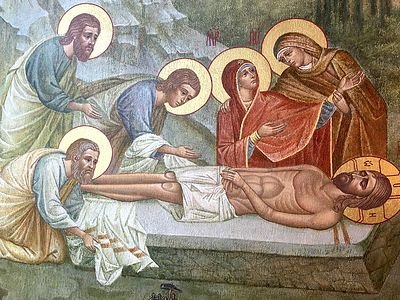 Иосиф купил плащаницу — длинное и ценное полотно. Тело Христа сняли с Креста, умастили его благовониями, обвили плащаницей и положили в новой погребальной пещере в саду Иосифа.
