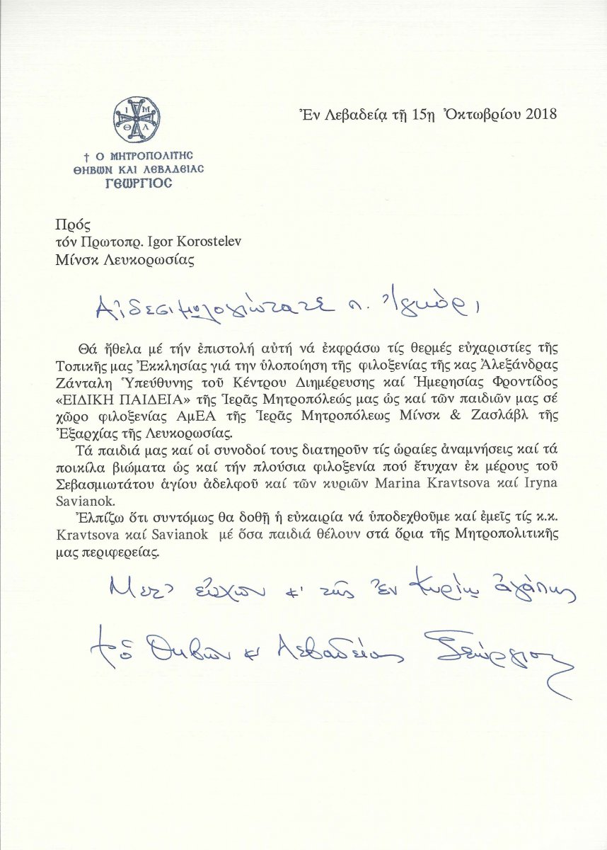 | 26 АПРЕЛЯ 2019 (Пятница) 11:50:03 Митрополит Фив и Ливадии Георгий (Греция) сердечно поблагодарил настоятеля прихода иконы Божией Матери "Всех скорбящих Радость" протоиерея Игоря Коростелёва, руководителя Социальных мастерских Марину Кравцову и всех причастных к организации радушного приёма на белорусской земле группы молодых людей с тяжёлыми ограничениями здоровья из Центра специального образования при Фивской и Ливадийской Митрополии Элладской Православной Церкви.Ваше Высокопреподобие, уважаемый отец Игорь, Настоящим письмом я хотел бы выразить глубочайшую благодарность приходу за понимание и чудесное гостеприимство, которое Минская Епархия Беларуси оказала госпоже Александре Зантали, ответственной за Центр специального образования нашей Митрополии, и госпоже Харе Сволянтопулу - социальному работнику нашего учреждения, а также нашим детям. Наши дети и их сопровождающие получили много радости за время пребывания, благодаря усилиям нашей любимой достопочтенной сестры, госпожи Марины Кравцовой, а также Ирины Савенок, и по-настоящему хранят самые тёплые воспоминания от этого визита. Сотрудничество и большая дружба связывает Социальные мастерские минского прихода иконы Божией Матери "Всех скорбящих Радость" и Центр специального образования при Фивской и Ливадийской Митрополии Элладской Православной Церкви. В 2013 году группа молодых людей, подопечных Социальных мастерских впервые посетила Центр специального образования при православной Митрополии. Группу молодых людей из Минска радушно принял митрополит Фив и Ливадии Георгий. Владыка благословил белорусских гостей продолжить сотрудничество с Центром специального образования при Митрополии и оказывать поддержку детям, молодым людям и взрослым с тяжёлыми ограничениями здоровья. Алексей, работник Социальных мастерских прихода: "Эта очень большая честь для всех нас побывать у такого доброго, милого и гостеприимного человека (Митрополита Фив и Ливадии Георгия, - прим.), Он искренне встречал нас, вручил такие замечательные подарки. Я думаю, что это один из лучших дней в нашей жизни. Мне кажется, у белорусов и греков много общего. Мы братья, мы православные". В образовательном центре при Митрополии занимаются 20 человек в возрасте от 18 лет. Под руководством педагогов, социальных работников и волонтёров молодые люди с ограничениями производят сувенирную продукцию, которая пользуется большим спросом на рождественских и пасхальных ярмарках. В Минск группа ребят с ограниченными возможностями из Греции приезжает уже дважды. Для них были организованы мастер-классы по работе с деревом, нитками, бумагой, посещение достопримечательностей Минска и Беларуси. "Международные обмены – это уникальная возможность для развития ребят даже с тяжёлыми ограничениями. На первый взгляд может показаться, что это просто путешествие, развлечение, в действительности за этой непростой работой стоит много стимулов, заставляющих меняться в лучшую сторону, усиливаться познавательную и эмоциональную сферы, хорошо развивается речь, навыки коммуникации, расширяется кругозор, обогащается личность наших ребят", - говорит директор Социальных мастерских, кандидат психологических наук, доцент Марина Кравцова Наталья, сотрудница социальных мастерских прихода Иконы "Всех скорбящих Радость": "Хот