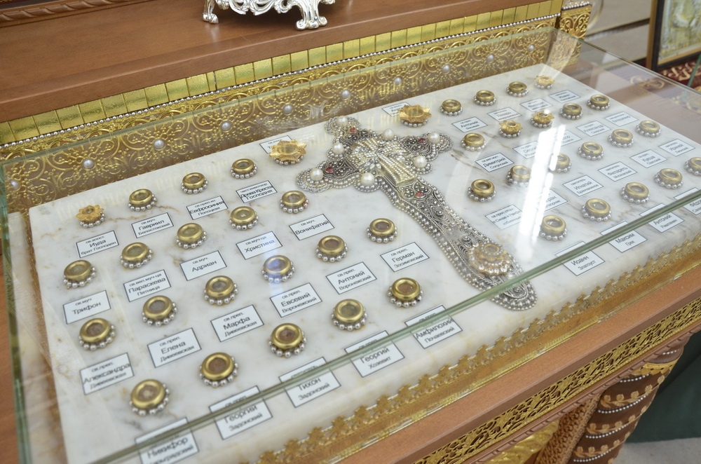 В мощевики помещены частицы мощей: великомученика Дмитрия Солунского, преподобных Сергия Радонежского, Александра Свирского, Кукши Одесского, Максима Грека, Филарета милостиваго, святителя Луки Крымского и других святых.