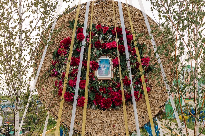 Гирлянды из живых садовых и полевых цветов, а также инсталляции из колосьев пшеницы - все эти украшения с молитвой в течение нескольких недель кропотливо изготавливали паломники. К слову, каждый, кто приезжает к матушке за молитвенной помощью, может потрудиться на святом месте.