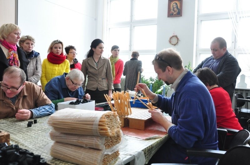 Работая в Социальных мастерских, люди с особенностями здоровья постепенно становятся непосредственными участниками жизни прихода и общества. Каждому в Мастерских находится труд по душе. Стать частью этой радушной команды может каждый, кому интересно освоить одно из нескольких направлений: художественная деревообработка, свечное производство, швейное дело, вязание, валяние ландшафтные работы.