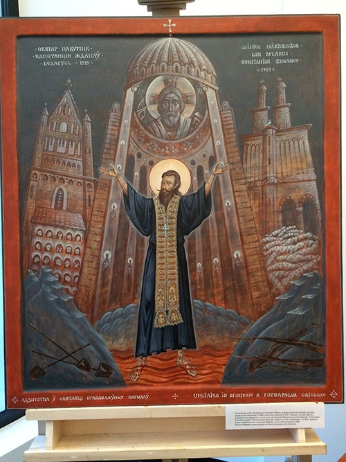 Новомученик стоит на фоне поднимающегося за его спиной храма, где Христос в куполе благословляет его. |  | На колоннах, которые поддерживают купол традиционно изображены другие фигуры мучеников – сила и крепость церкви. Как свечи горят их светлые нимбы, так огонь веры вздымается ввысь. Слева - символ беларуской церкви, Сынковической, - шедевра беларуской архитектуры ХIV века. В нишах беларуской церкви изображены мощи святых. Над ними свет, напоминающий нимбы – символ святости. Это изображение того, что мученики беларуской Церкви канонизированы. Справа - церковь Крецулеску. Это архитектурная достопримечательность Румынии, у её основания хранятся мощи убиенных верующих, запелёнутые как в древности. Но они пока без нимбов - символ того, что не все мученики в Румынии прославлены Церковью. Орел с крестиком в клюве - ещё один намек на святость национальной Румынской Церкви.