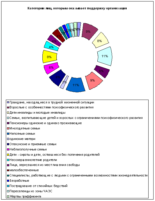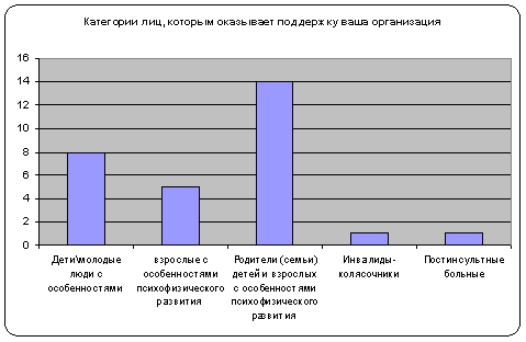 При отборе организаций особое внимание уделялось возрасту и характеру заболевания людей, с которыми они работают. Надо признать, что при создании системы помощи людям с особенностями психофизического развития наибольшее внимание уделялось детям. Вопросы психологической и социально-педагогической реабилитационной работы в отношении взрослых требуют развития. Именно поэтому ситуация взрослых людей с особенностями психофизического развития представляла для исследования наибольший интерес.