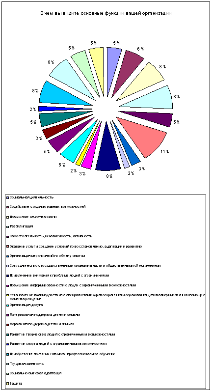 Во-вторых, в исследовании важно было представить различные структуры: государственные, общественные, религиозные. Большая доля инициатив в проведении реабилитационной работы людей с особенностями психофизического развития принадлежит общественным родительским организациям. Именно они стали инициаторами первых центров дневного пребывания и продолжают сохранять высокий уровень активности в решении проблем, с которыми сталкиваются семьи с детьми с особенностями развития. Среди государственных учреждений в большей мере к опросу были привлечены территориальные центры социального обслуживания населения, поскольку именно там проходит работа по реабилитации взрослых людей с ограниченными возможностями и именно в этих центрах есть хорошие перспективы развития новых направлений социализации и интеграции людей с проблемами здоровья. В частности, в ближайшее время ТЦСОНы планируют проведение мероприятий по организации профессионального обучения и трудоустройства людей с особенностями развития. Среди религиозных организаций были представлены православные храмы, при которых в настоящее время действуют специализированные мастерские, обеспечивающие защищенные рабочие места для взрослых людей с интеллектуальной недостаточностью и другими проблемами здоровья