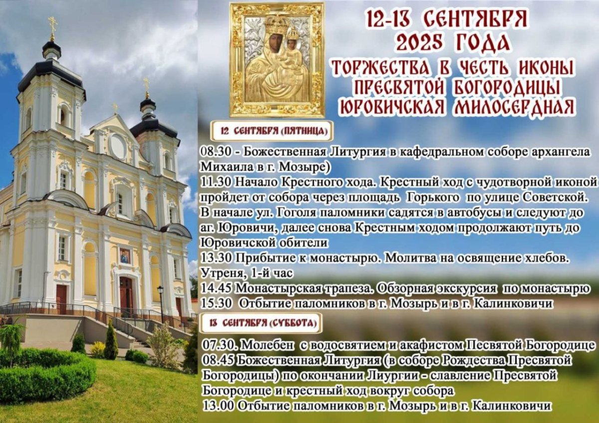 12 сентября, накануне дня празднования одной из главных святынь Полесского края - иконы Божией Матери Юровичская-Милосердная, пройдет ежегодный Крестный ход из кафедрального собора святого Архангела Михаила в г. Мозыре в Юровичский Рождество-Богородичный мужской монастырь. 13 сентября в Юровичской обители состоится торжественное Богослужение.