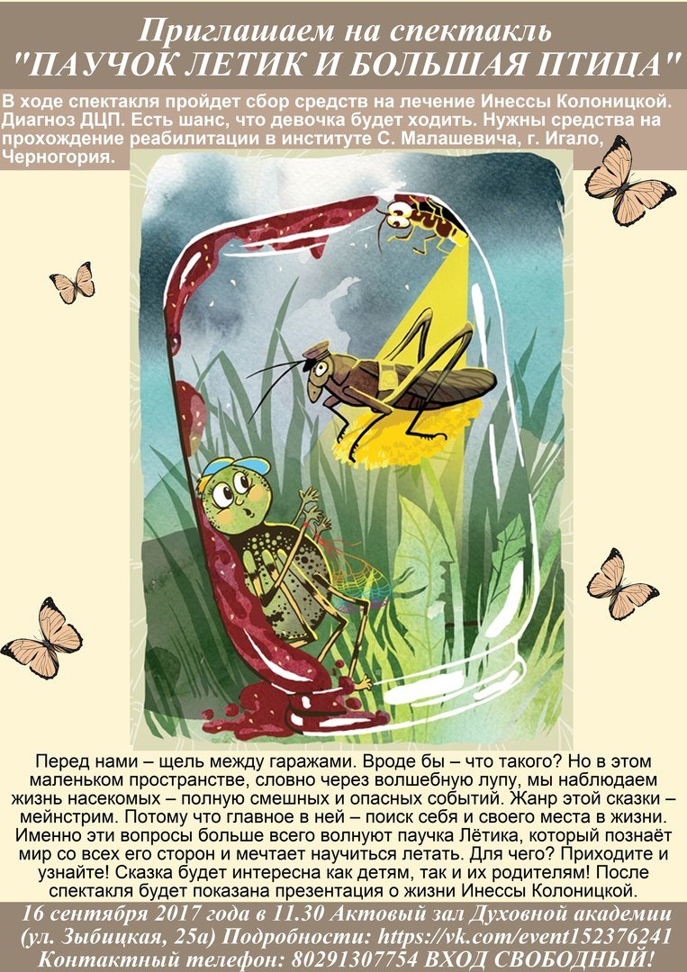 16 сентября в актовом зале Минской духовной академии пройдёт благотворительный спектакль для всей семьи "Паучок Лётик и Большая птица". Начало в 11:30. Вход свободный.