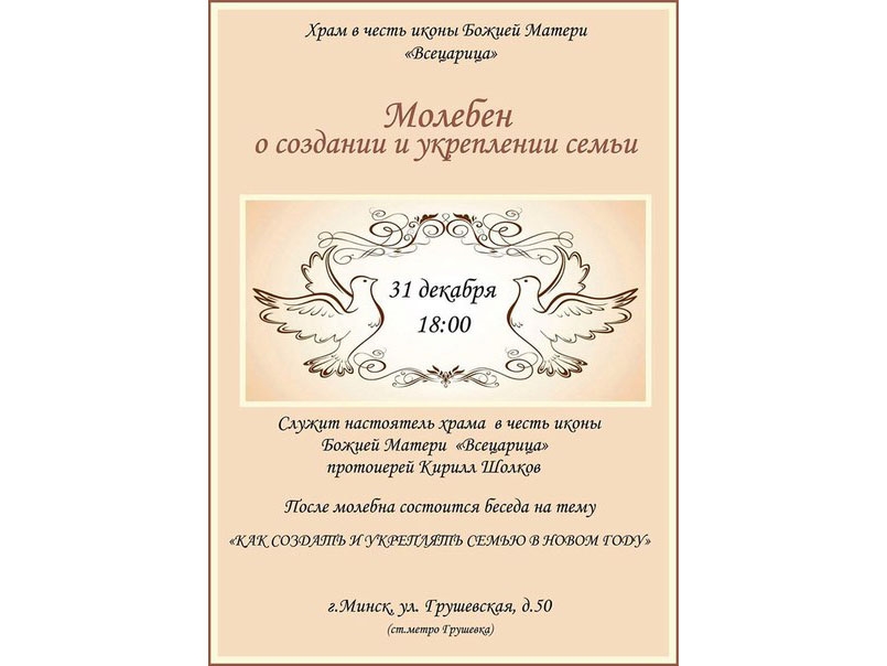 31 декабря, в канун Нового года, в минском приходе иконы Божьей матери "Всецарица" состоится молебен о создании и укреплении семьи. Начало в 18.00.