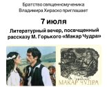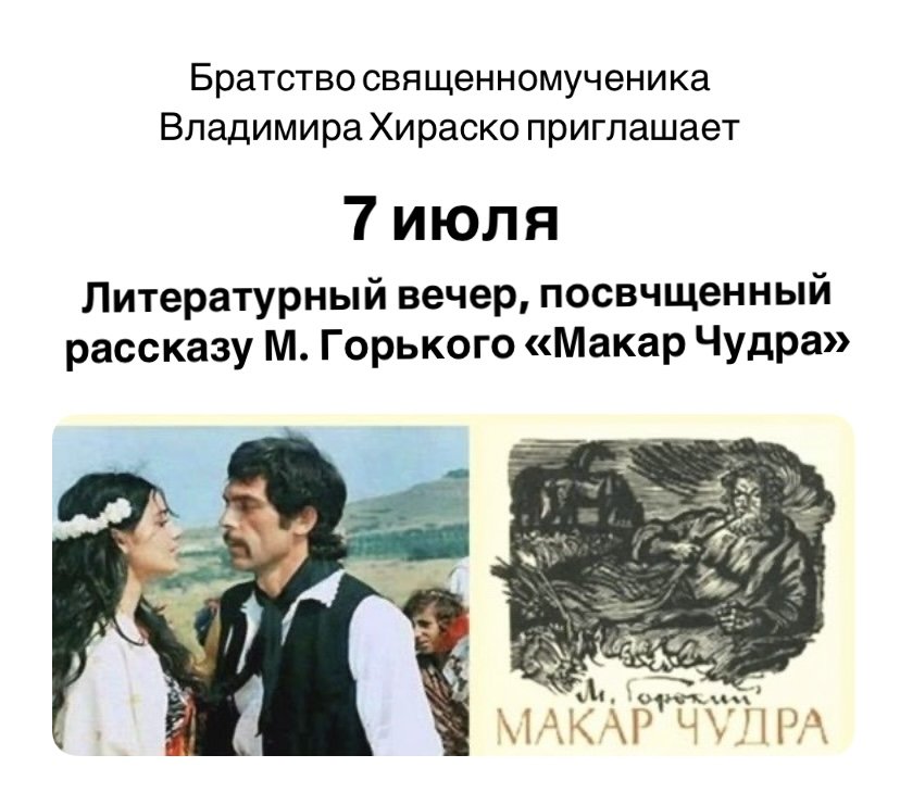 7 июля братство священномученика Владимира Хираско прихода иконы Божией Матери "Всех скорбящих Радость" города Минска приглашает на литературный вечер, посвященный рассказу М. Горького "Макар Чудра", с филологом Натальей Клопоток.