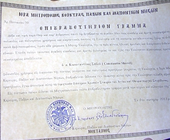 Белорусский благотворитель Константин Георгиевич Шавель решением Митрополичьего совета Митрополии Керкирской, Паксийской и Диапонтийских островов награжден орденом Святого Спиридона. Награду вручил 10 мая 2013 года Митрополит Нектарий, глава делегации Элладской Православной Церкви в Минском епархиальном управлении во время встречи делегации с Митрополитом Минским и Слуцким Филаретом, Патриаршим Экзархом всея Беларуси. «Орден называется Золотой Крест Святого Спиридона. Такие ордена мы вручаем людям, которые сделали очень многое для Церкви, – пояснил в интервью sobor.by Митрополит Нектарий, – господин Константин сделал очень многое для храма Святителя Спиридона на Керкире (Корфу). Этим орденом мы хотим от всего сердца поблагодарить Константина за его служение и пожелать благоденствия и в его семье и в его работе. Сегодня мы побывали на его предприятии и убедились, что он помогает не только людям, которые у него работают, но и их семьям. Я очень хочу пожелать долголетия и крепкого здоровья». В тексте Митрополичьей наградной Грамоты сказано, что Константина Георгиевича: «Ставшего благочестиво полезным и многоценное приносящего служение вере и Церкви, Святая Митрополия Керкиры, Пакса и Диапонтийских островов, желая наградить такое благочестивое к Церкви его посвящение и преданность, вручает ему почетный знак отличия Золотой крест Святого Спиридона Чудотворца. В подтверждении сего выдается эта Митрополичья Наградная Грамота с благословением Церкви Керкиры, Пакс и Диапонтийских островов». Как рассказал sobor.by настоятель храма Святителя Спиридона в Керкире протопресвитер Георгий Влаху, этот орден был учрежден предыдущим правящим архиереем Керкирской Митрополии Митрополитом Тимофеем (Тривизас) в 1990 году. Константин Шавель пятый представитель Русской Православной Церкви, ставший кавалером ордена Святого Спиридона. Первым в Русской Церкви орден получил Святейший Патриарх Алексий II, вторым – Святейший Патриарх Кирилл, затем Митрополит Киевский и всея Украины Владимир и Митрополит Астанайский и Казахстанский Александр. Константин Георгиевич Шавель, генеральный директор фирмы «Шате-М Плюс», является ктитором Полоцкого Спасо-Евфросиниевского монастыря и малым ктитором храма святителя Спиридона в Керкире. На протяжении долгих лет Константин Георгиевич делает многое для возрождения Белорусской Православной Церкви и для укрепления её духовных связей с Элладской Церковью и с монастырями Святой Горы Афон. В организации и проведении принесения десницы святителя Спиридона Тримифунтского для поклонения верующим Беларуси с 9 по 18 мая 2013 года по благословению Митрополита Минского и Слуцкого Филарета Константин Шавель принимает самое активное участие. Среди наиболее значимых событий, в которых также участие Константина Георгиевича имело решающее значение – визит игумена афонского монастыря Ватопед архимандрита Ефрема в ноябре 2011 года в пределы Белорусской Православной Церкви. / sobor.by/ (просмотров 16956)