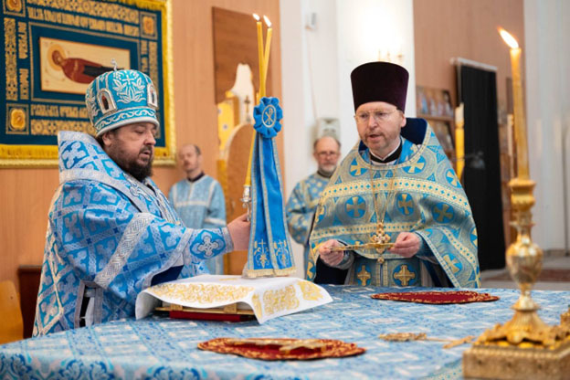 Его преосвященству сослужили настоятель прихода протоиерей Игорь Коростелев и клирики прихода.
