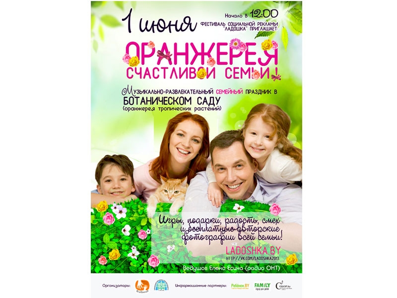 1 июня в 12:00 Фестиваль социальной рекламы «Ладошка» приглашает всех принять участие в музыкально-развлекательном семейном празднике «Оранжерея счастливой семьи», который пройдет в зеленом оазисе Ботанического сада, на сцене у оранжереи тропических растений. В тени цветущих растений вы сможете укрыться от городской суеты и провести выходной с близкими вам людьми, а также поучаствовать в представлении. Вас ожидают активные игры, розыгрыши, загадки, семейные соревнования, инсценировки, призы и море праздничного настроения! Семейный праздник «Оранжерея счастливой семьи» организован Фестивалем социальной рекламы «Ладошка», при организационной поддержке ГНУ «Центральный ботанический сад НАН Беларуси» и направлен на поддержку семьи и семейных ценностей. Ведущая «Оранжереи счастливой семьи» Елена Есина (радиоведущая) проведет увлекательные конкурсы для детей и взрослых, объединяющие семью и воспитывающие командный дух.