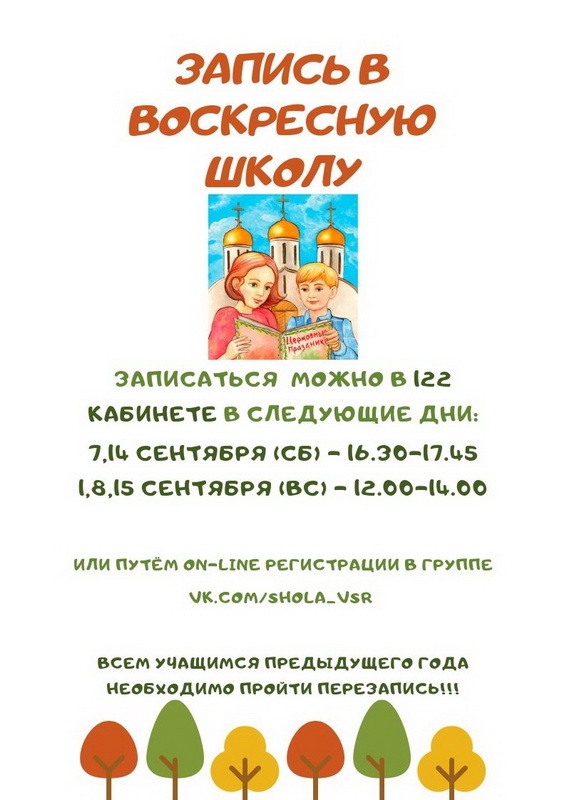 Итоговые списки групп можно будет найти в группе vk.com/shola_vsr и в день начала занятий в фойе воскресной школы. Всю информацию о начале учебного года можно будет найти в группе в контакте.