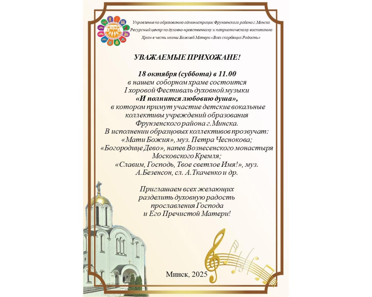 | | 17 ОКТЯБРЯ 2025 (Пятница) 12:42:10 18 октября в храме иконы Божией Матери "Всех скорбящих Радость" города Минска состоится I хоровой Фестиваль духовной музыки "И полнится любовию душа".
