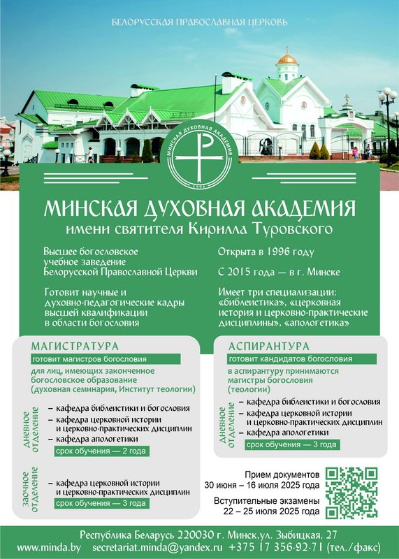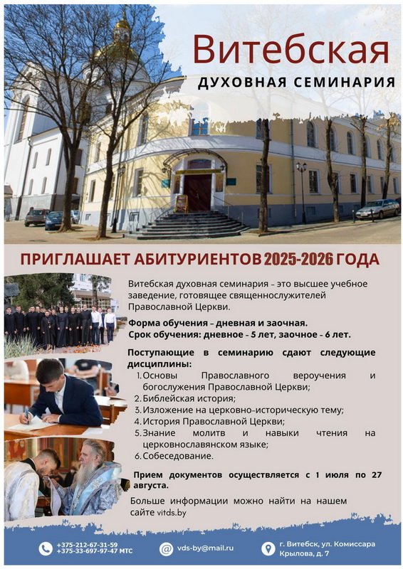 Объявлены правила приема в 2025 году в духовные учебные заведения Белорусской Православной Церкви – Минскую духовную академию, Минскую духовную семинарию, Витебскую духовную семинарию, Институт теологии БГУ, Минское духовное училище, Витебское женское духовное училище, Оршанское духовное училище.