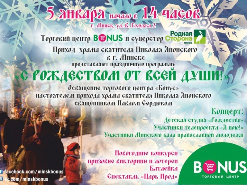 Праздничную программу «С РОЖДЕСТВОМ ОТ ВСЕЙ ДУШИ», приуроченную к празднику Рождества Христова, готовит минский приход храма в честь святого Николая Японского. Откроется мероприятие в канун Рождественского сочельника - 5 января, в 14.00, в ТЦ «Бонус» (мкр-н Домбровка, ул. Владислава Голубка, 2). В рамках мероприятия состоится освящение торгового центра «Бонус».