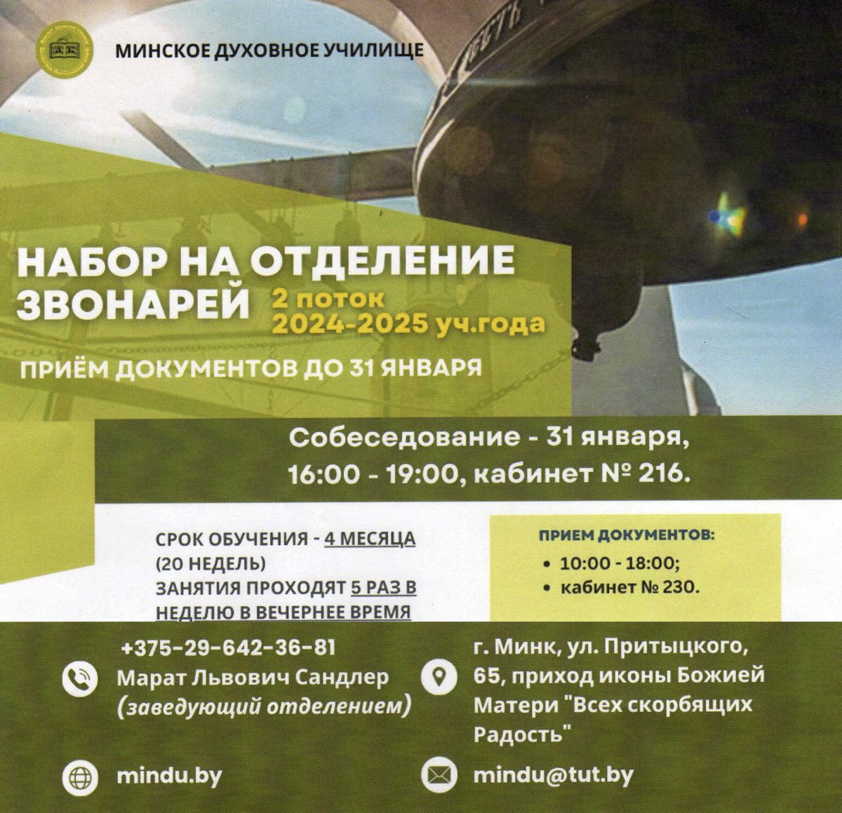 Более подробная информация об отделении звонарей - на сайте mindu.by, а также в канцелярии МинДУ (гор. тел.: +37517 3770519, моб. тел.: +37529 8755909, +37544 5109072, эл. почта: mindu@tut.by), у заведующего отделением - Сандлера Марата Львовича (+37529 6423681).