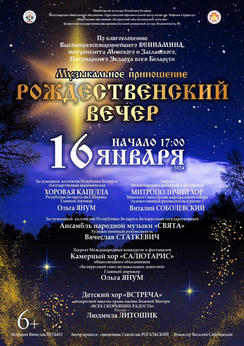 16 января 2024 года в Большом зале Белорусской государственной филармонии состоится Рождественский вечер Международного общественного объединения "Христианский образовательный центр имени святых Мефодия и Кирилла". Рождественский вечер является ежегодным церковно-общественным мероприятием и проводится с 1999 года.