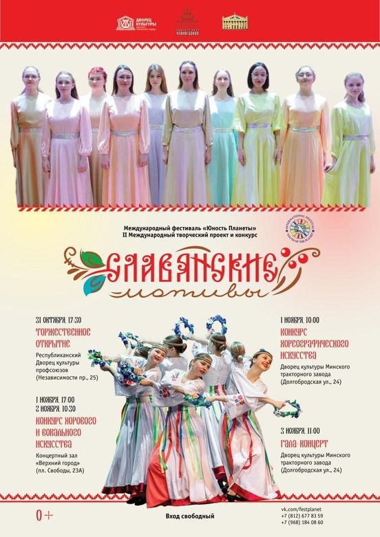 | | 25 ОКТЯБРЯ 2022 (Вторник) 13:58:54 С 31 октября по 3 ноября в Минске, в рамках международного фестиваля "Юность планеты", состоится Второй Международный творческий проект и конкурс " Славянские мотивы".