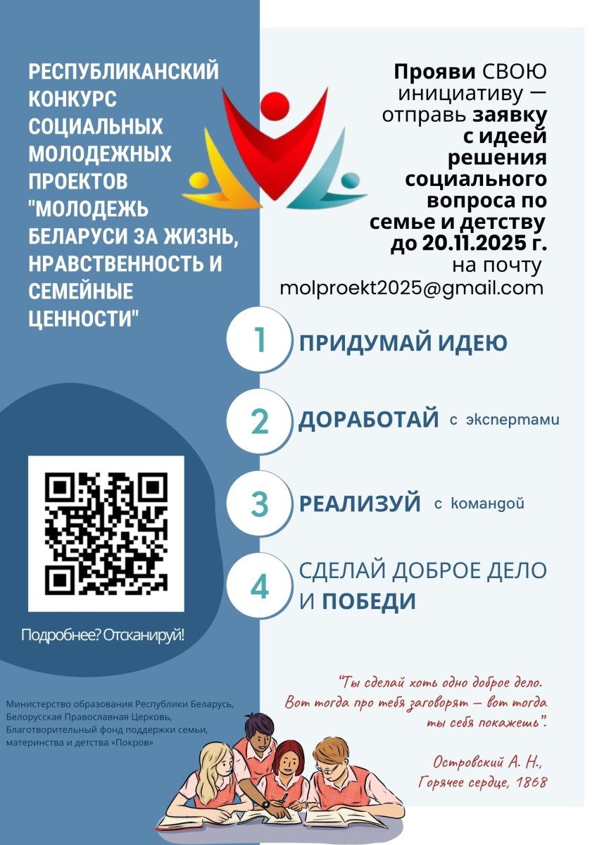 В 2025-2026 учебном году у обучающихся государственных учреждений высшего, общего среднего, профессионально-технического, среднего специального, а также дополнительного образования Республики Беларусь снова появится возможность реализовать свою идею по решению социально-значимых проблем современного общества, связанных с темами семьи, здоровья, нравственности как основы альтернативы негативным явлениям в обществе.