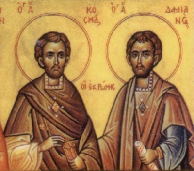 Святые мученики, чудотворцы и бессребреники Косма и Дамиан - родные братья, родом из Рима, врачи по профессии, приняли мученическую кончину в Риме при императоре Карине. Воспитанные родителями-христианами в правилах благочестия, они вели строгую, целомудренную жизнь и были удостоены от Бога благодатного дара исцеления болезней. Своим добрым и бескорыстным отношением к людям, соединенным с исключительным милосердием, братья многих обращали ко Христу. Святые обычно говорили больным: «Не своей силой мы врачуем болезни, а силой Христа, Истинного Бога. Веруйте в Него и будете здоровы». За бескорыстное лечение недугующих святых братьев называли «безмездными врачами».