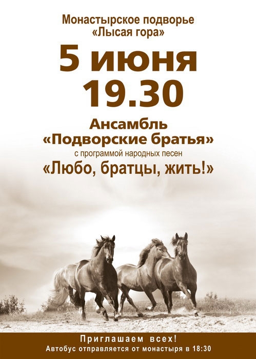 5 июня на подворье Свято-Елисаветинского монастыря «Лысая гора», что под Минском, с программой «Любо, братцы, жить!» выступит ансамбль «Подворские братья». Начало концерта в 19.30. Автобус от монастыря отправляется в 18.30. На концерт приглашаются все желающие.