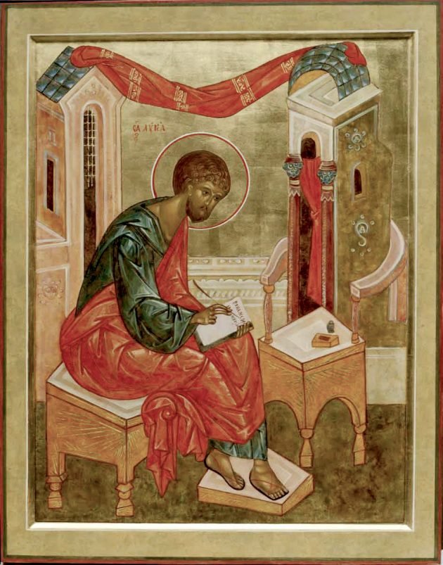 Предание усваивает ему написание первых икон Божией Матери. "Благодать Рождшегося от Меня и Моя милость с сими иконами да будет", - сказала Пречистая Дева, увидев иконы. Святой Лука написал также иконы святых первоверховных апостолов Петра и Павла. Евангелие написано им в 62 - 63 годах в Риме, под руководством апостола Павла. Святой Лука в первых стихах (Лк. 1,3) четко выразил цель своего труда: наиболее полно и в хронологической последовательности описал по порядку всё, что известно христианам об Иисусе Христе и Его учении, и тем самым дал твердое историческое обоснование христианского упования (Лк. 1, 4). Он тщательно исследовал факты, широко использовал устное предание Церкви и рассказы Самой Пречистой Девы Марии (Лк.2,19;Лк.2,51).