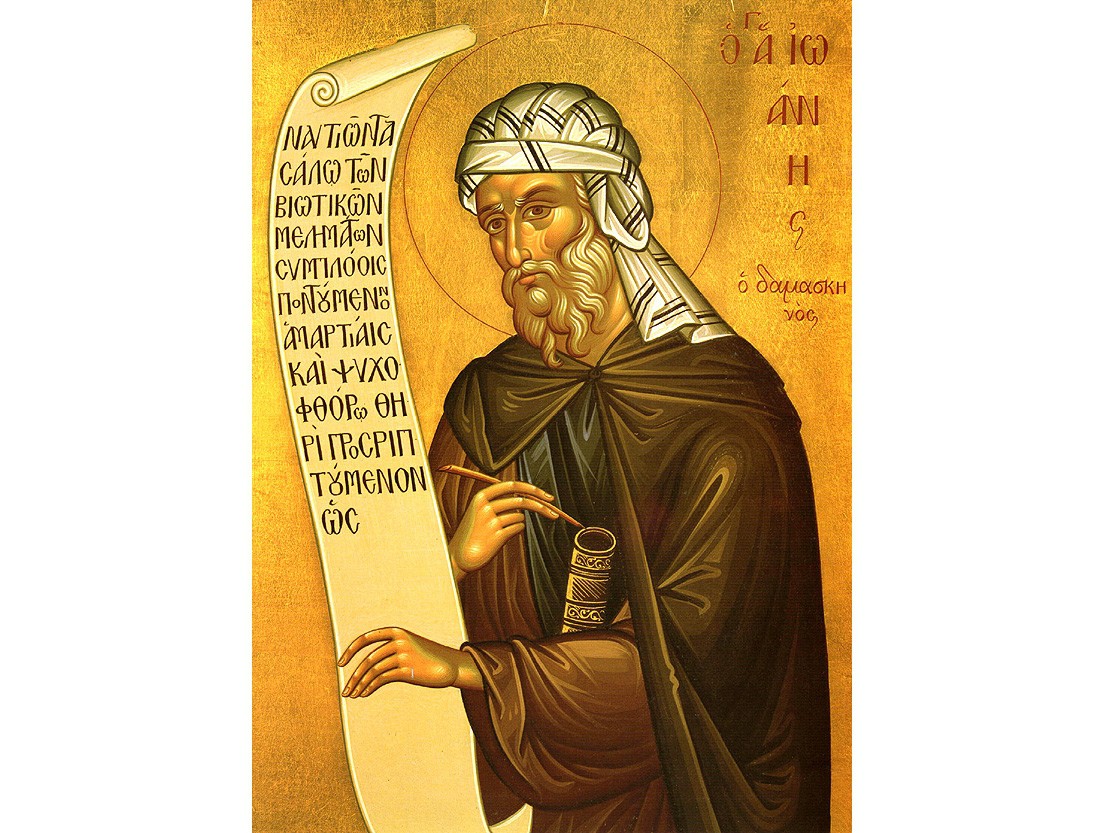 Преподобный Иоанн Дамаскин родился около 680 года в столице Сирии, Дамаске, в христианской семье. Его отец, Сергий Мансур, был казначеем при дворе халифа. У Иоанна был приемный брат, осиротевший отрок Косма, которого Сергий принял к себе в дом. Когда дети подросли, Сергий позаботился об их образовании. На Дамасском невольничьем рынке выкупил он из плена ученого монаха Косму из Калабрии и поручил ему учить детей. Мальчики обнаружили необыкновенные способности и легко освоили курс светских и духовных наук.