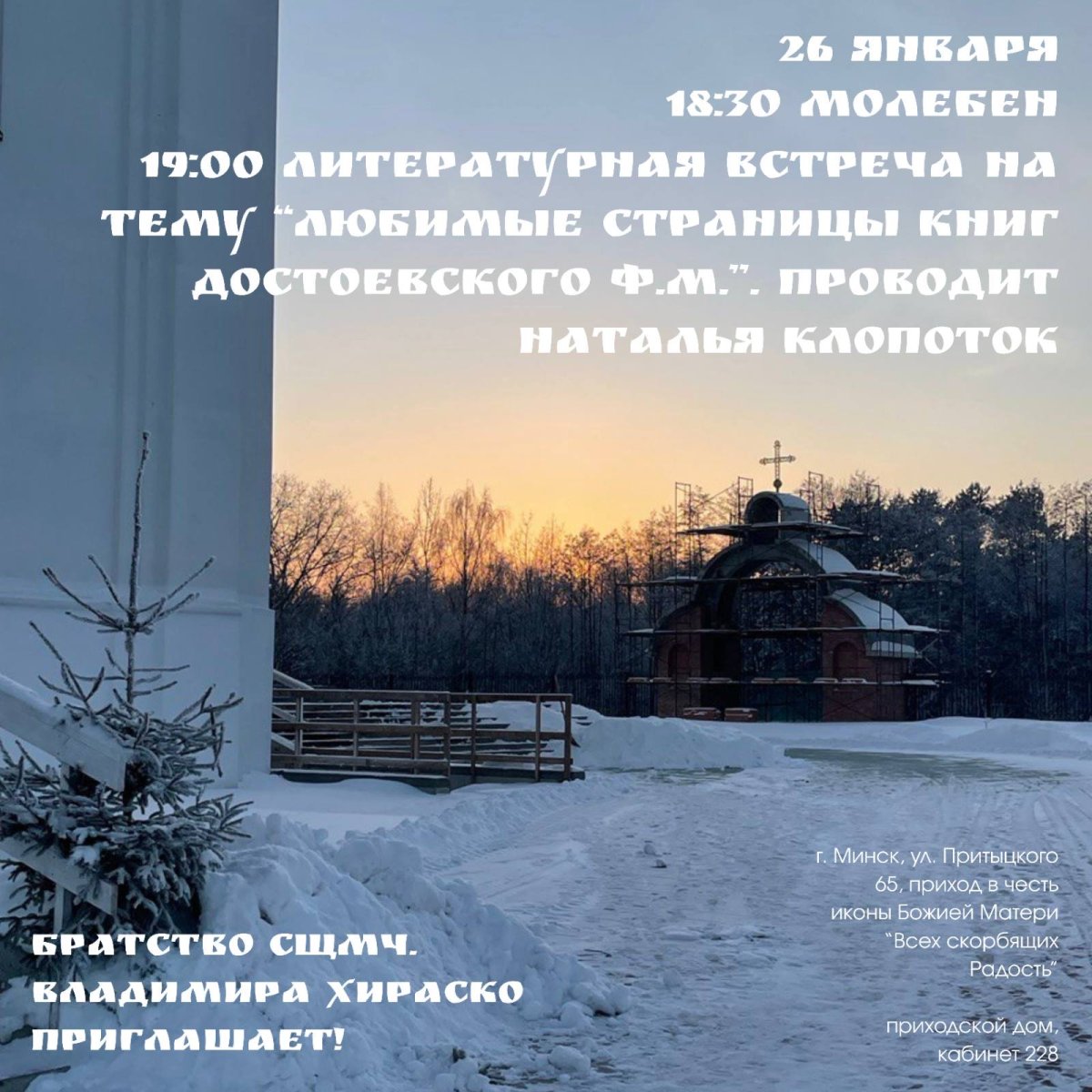 26 января в приходе иконы Божией Матери "Всех скорбящих Радость" города Минска состоится литературная встреча на тему "Любимые страницы книг Ф.М. Достоевского".