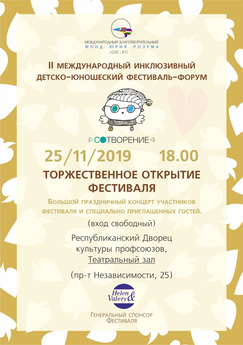 18.00 – 20.00 – Торжественное открытие II Международного инклюзивного детско-юношеского фестиваля-форума "СоТворение" - концерт участников фестиваля и специально приглашённых гостей на сцене Театрального зала Республиканского Дворца культуры профсоюзов (пр-т Независимости, 25) Вход свободный.