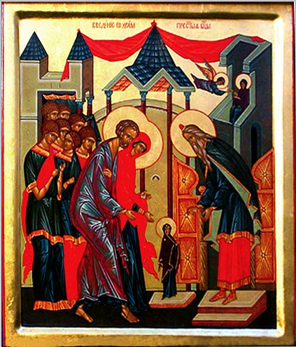 Иоаким и Анна, праведные Богоотцы, молясь Господу о даровании им дитяти, дали обет посвятить Богу своё чадо. Поэтому, когда их дочери Марии минуло три года, во исполнение своего обета они отдают её на воспитание в Иерусалимский храм. По свидетельству Священного Писания и сообщению историка Иосифа Флавия, вокруг сего храма в три этажа высились жилые помещения, в которых обитали юные девы, вдовицы и бессупружные мужи, служившие Господу во храме. Иоаким и Анна пригласили родственников и знакомых, нарядили дочь в белые одежды и с песнопениями, неся зажжённые свечи, торжественно повели её во храм. Трёхлетнюю Богоотроковицу поставили на первую ступень лестницы, - и та сама, без посторонней помощи, одолела все пятнадцать ступеней храмового здания. У входа Марию встретил первосвященник Захария – будущий отец Иоанна Предтечи и, пророчески свидетельствуя о высочайшем предназначении Приснодевы стать Богоматерью, ввёл её в Святая Святых – особое помещение Иерусалимского храма. Принеся жертву Богу, Иоаким и Анна вернулись домой. Божественную же Деву, по свидетельству церковного предания, с тех пор и во всё время Её жизни в Иерусалимском храме непрестанно охраняли Ангелы Божии. / sobor.by/ протоиерей Игорь Коростелев/