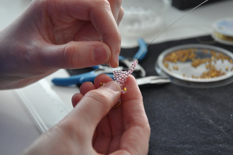 Теперь набираем бисер для туловища. Через одну проволоку продеваем 2 розовые бисерины. Затем продеваем через них вторую проволоку «восьмеркой». Набираете 9 рядов, в каждом ряду количество бусин на одну больше, получается, что концы проволоки расположены с двух сторон, закрутите их.