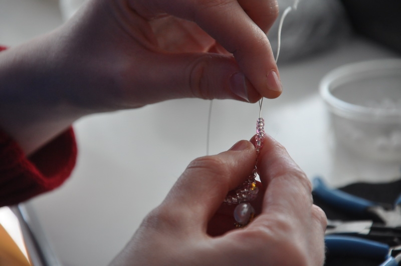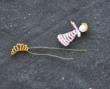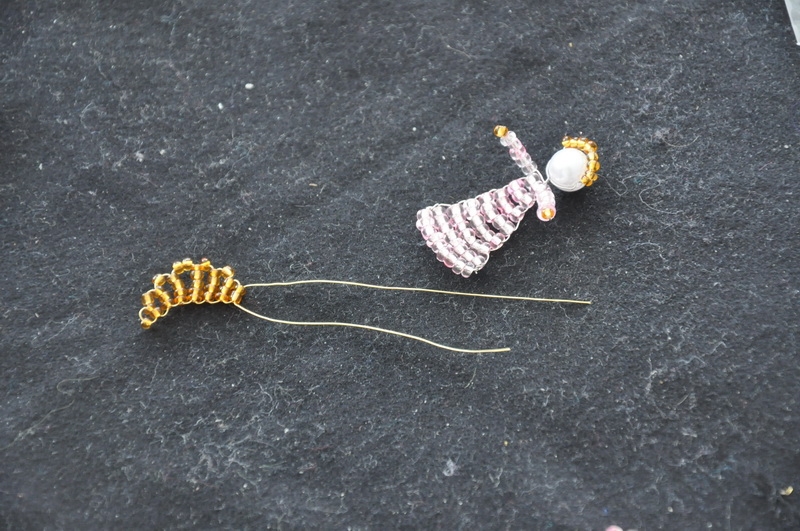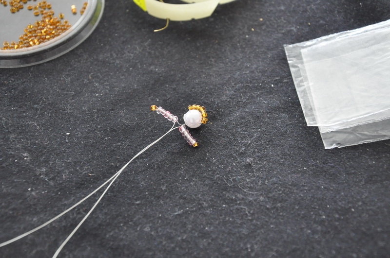 Приступаем к плетению рук ангела. Через одну проволоку пропускаем 5 розовых бисерин и 1 жёлтую бисерину. Затем протягиваем проволоку через набранные розовые бисерины. Аналогично делаем и вторую руку.