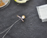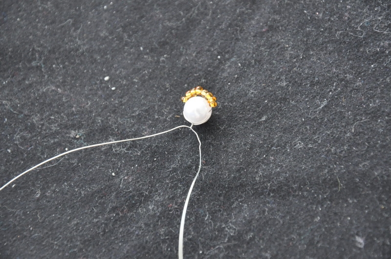 Отрезаем 45 cm проволоки и пропускаем через неё 8 жёлтых бисерин. Затем берём жемчужную бусину и пропускаем через неё проволоку «восьмеркой».