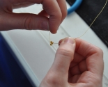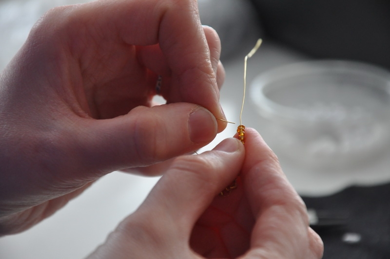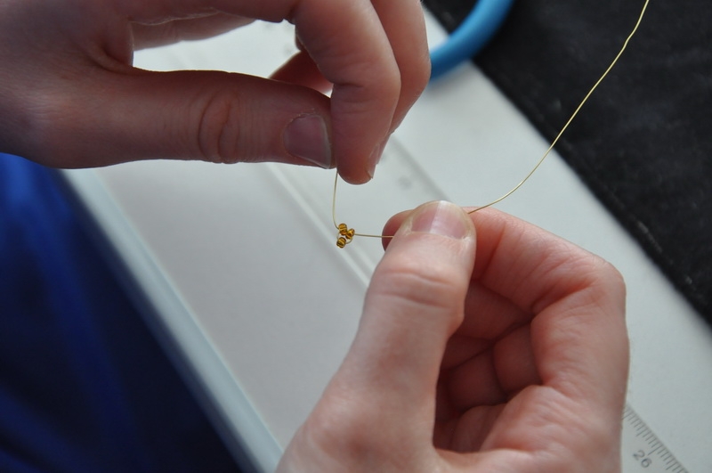 Приступаем к плетению крыльев. Отрезаем 17 cm проволоки. Пропускаем через неё жёлтую бисерину.
