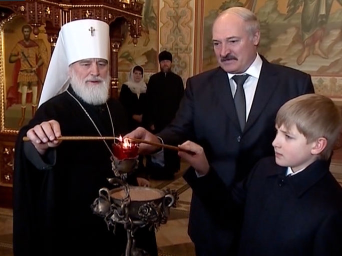 Перед тем, как зайти в храм, Александр Лукашенко вместе с младшим сыном Николаем возложил цветы к памятнику Святейшему Патриарху Алексию ІІ. В Храме Александра Лукашенко встречал Патриарший Экзарх всея Беларуси Митрополит Минский и Слуцкий Павел.