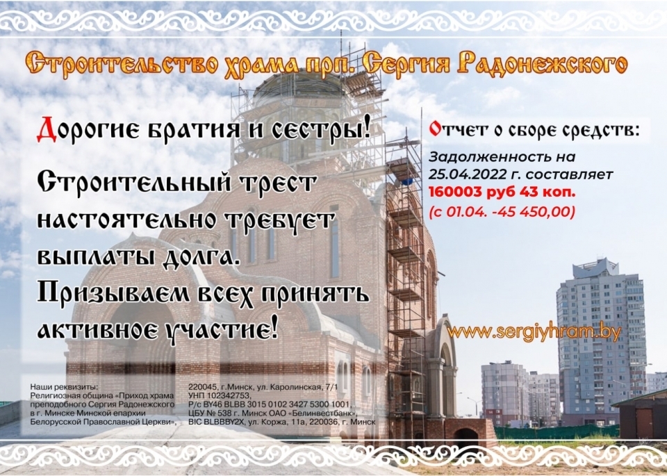 Приход в честь преподобного Сергия Радонежского в городе Минске обращается за помощью в строительстве храма.