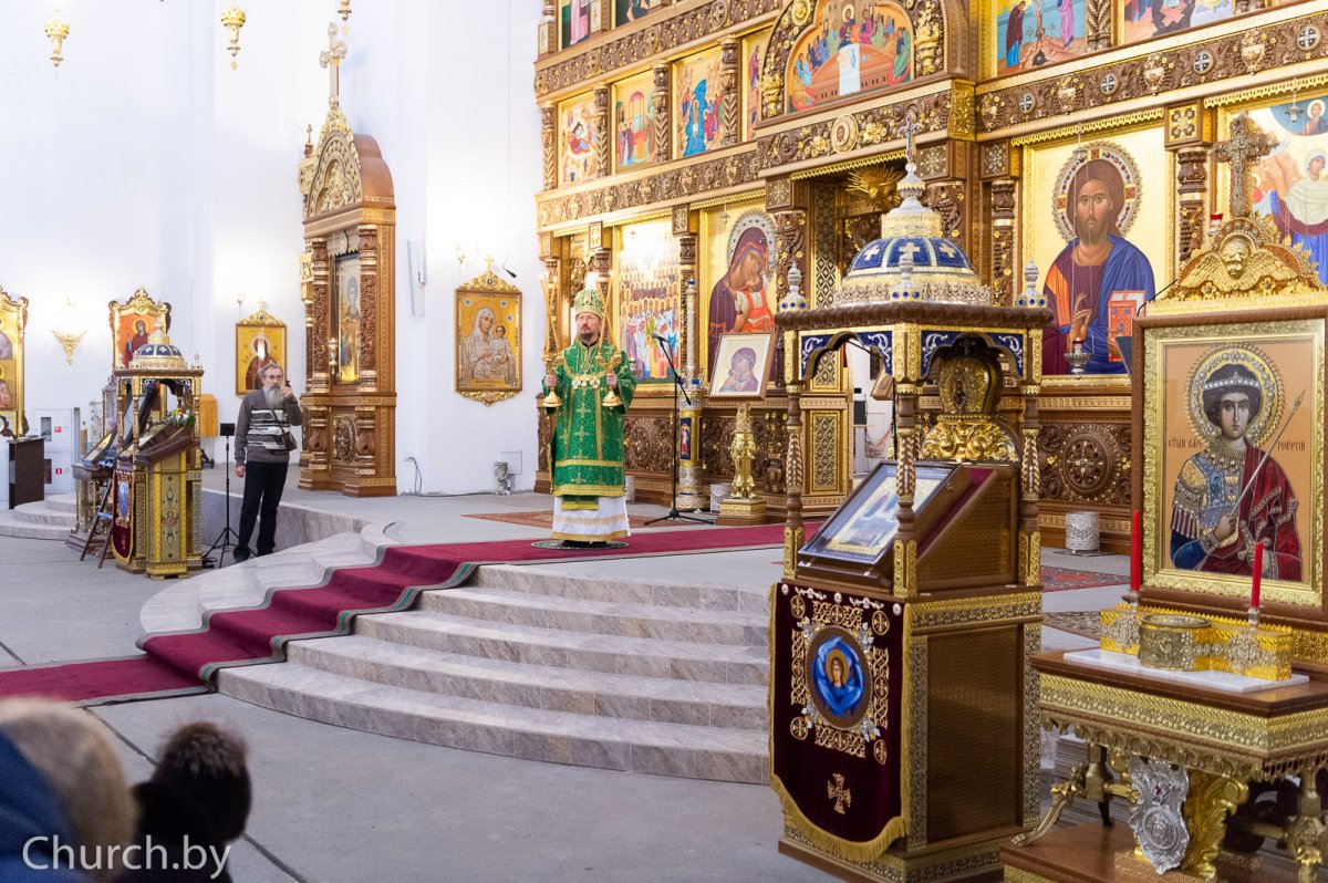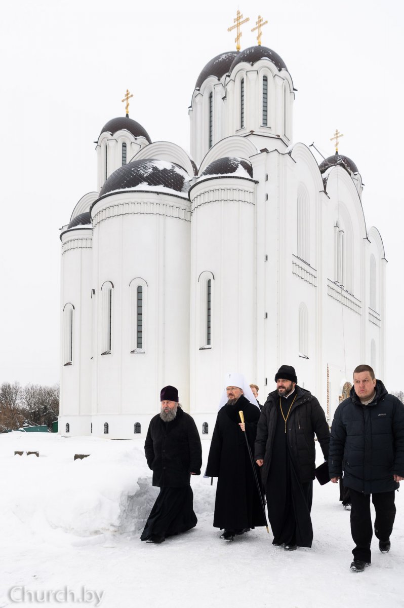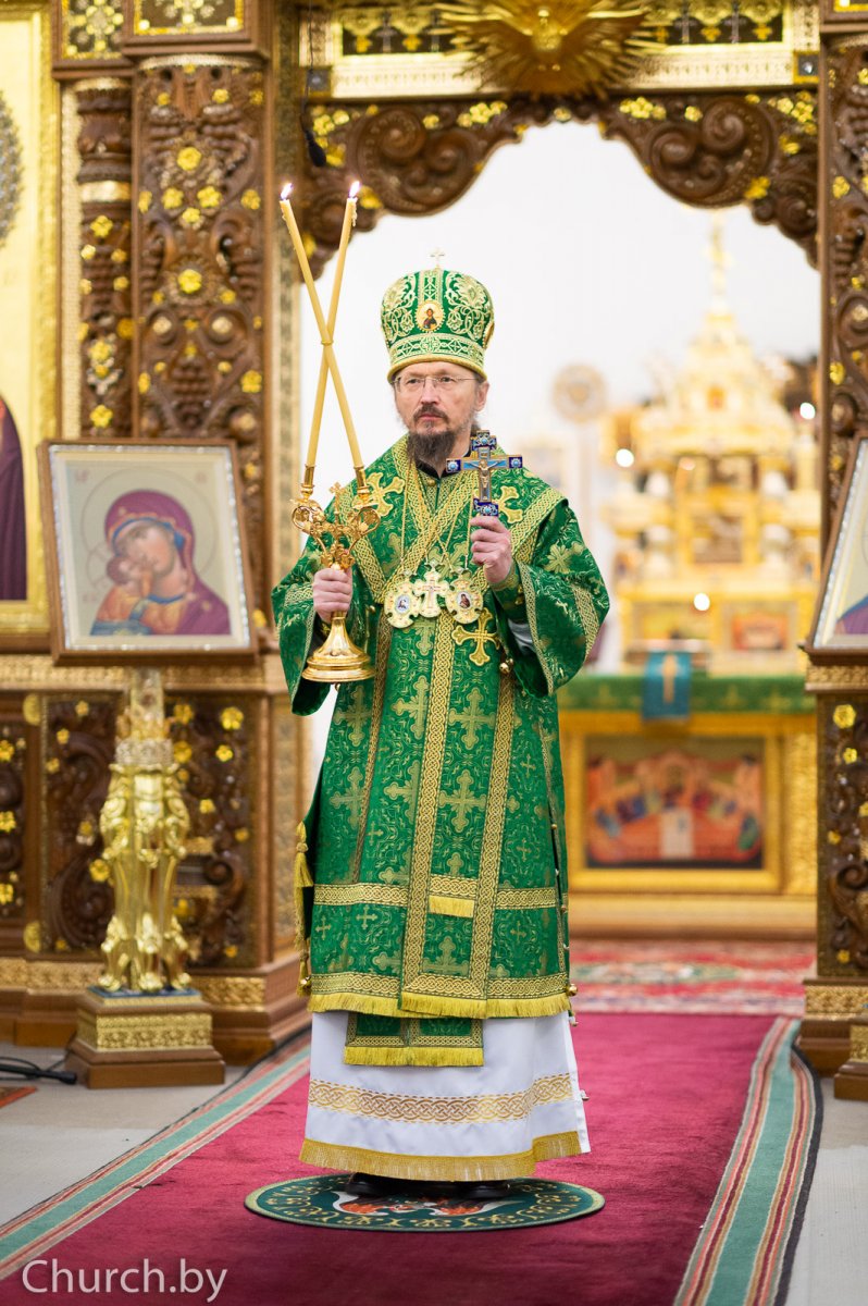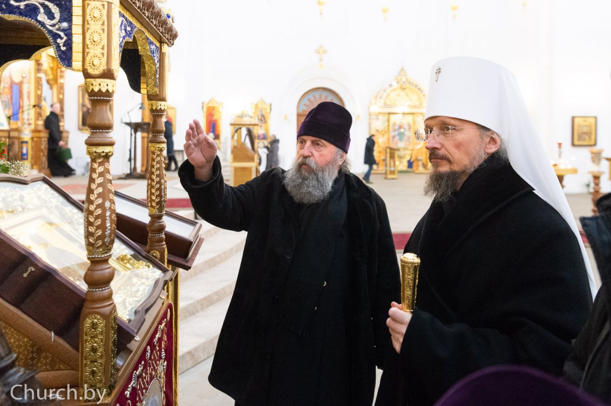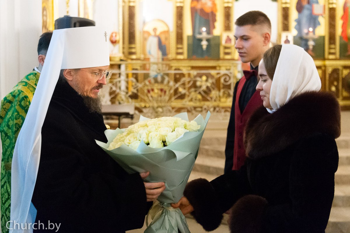 Его Высокопреосвященству сослужили: ректор Минской духовной академии архимандрит Афанасий (Соколов); председатель Синодального отдела БПЦ по взаимодействию с казачеством, председатель Синодального отдела БПЦ по церковному искусству, архитектуре и реставрации, благочинный 2-го Минского городского округа, настоятель прихода храма иконы Божией Матери "Всех скорбящих Радость" города Минска протоиерей Игорь Коростелёв; секретарь Минской епархии протоиерей Андрей Волков; директор Минского духовного училища, настоятель храма Святого Духа поселка Гатово Минского района протоиерей Иоанн Задорожин и приглашённые гости в священном сане.