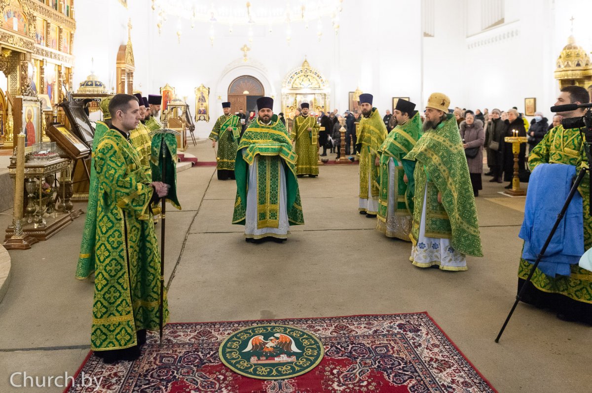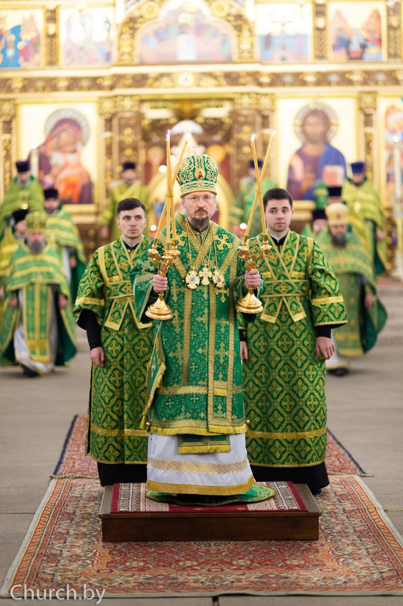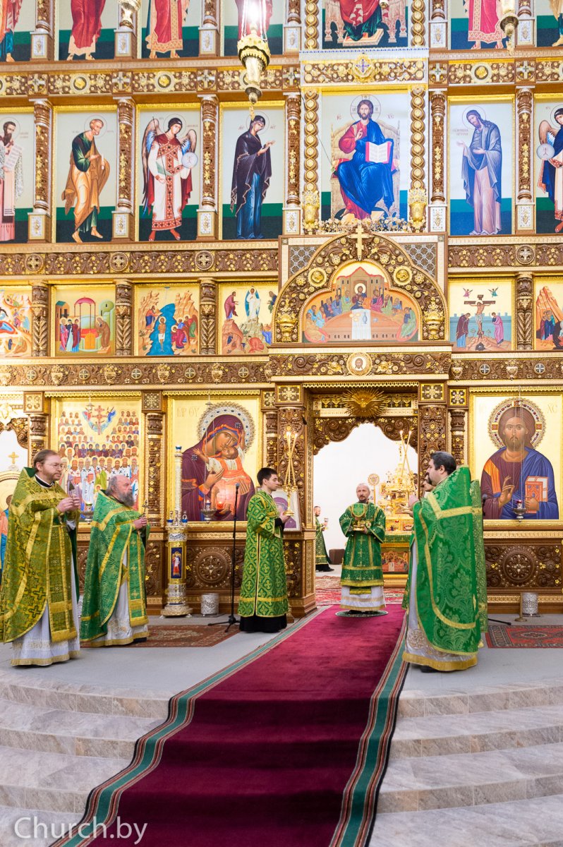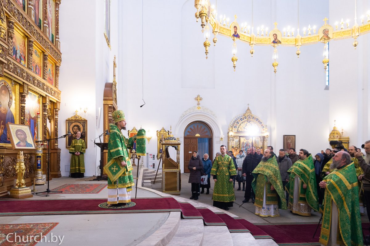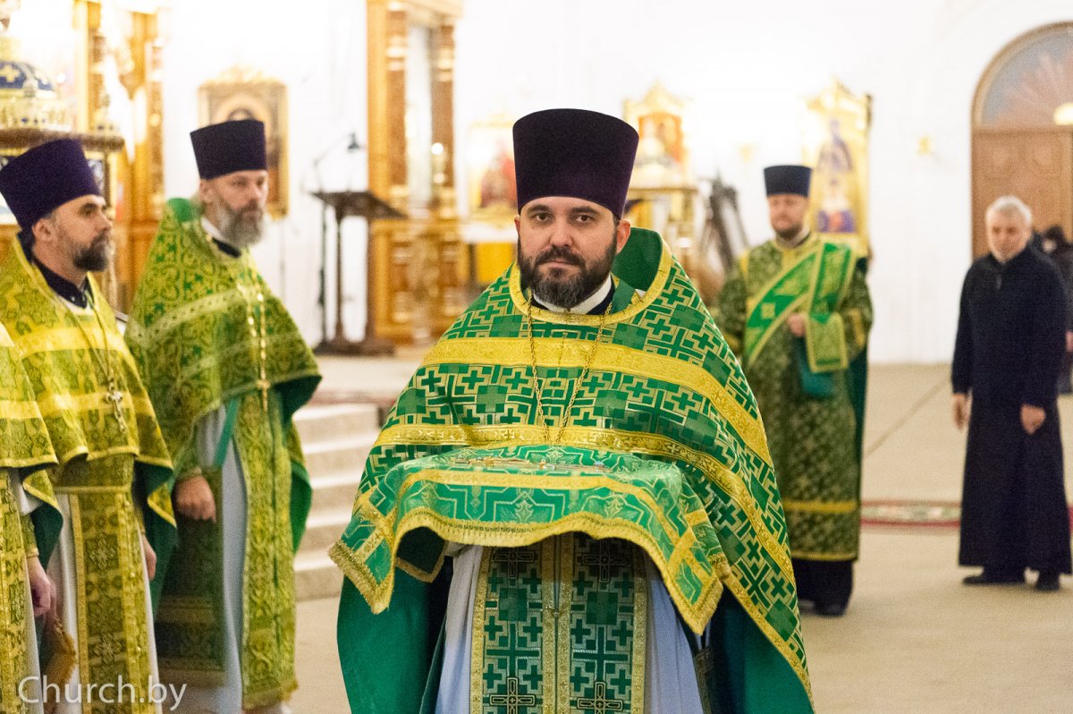 Его Высокопреосвященству сослужили: ректор Минской духовной академии архимандрит Афанасий (Соколов); председатель Синодального отдела БПЦ по взаимодействию с казачеством, председатель Синодального отдела БПЦ по церковному искусству, архитектуре и реставрации, благочинный 2-го Минского городского округа, настоятель прихода храма иконы Божией Матери "Всех скорбящих Радость" города Минска протоиерей Игорь Коростелёв; секретарь Минской епархии протоиерей Андрей Волков; директор Минского духовного училища, настоятель храма Святого Духа поселка Гатово Минского района протоиерей Иоанн Задорожин и приглашённые гости в священном сане.