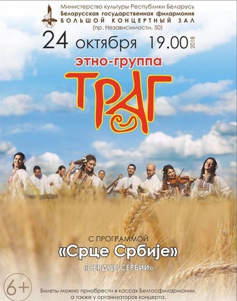 24 октября в Белорусской государственной филармонии выступит этно-группа "Траг" (Республика Сербская, Босния и Герцеговина) с программой "Срце Србиjе" ("Сердце Сербии"). Концерт проводится по благословению митрополита Минского и Заславского Павла, Патриаршего Экзарха всея Беларуси.