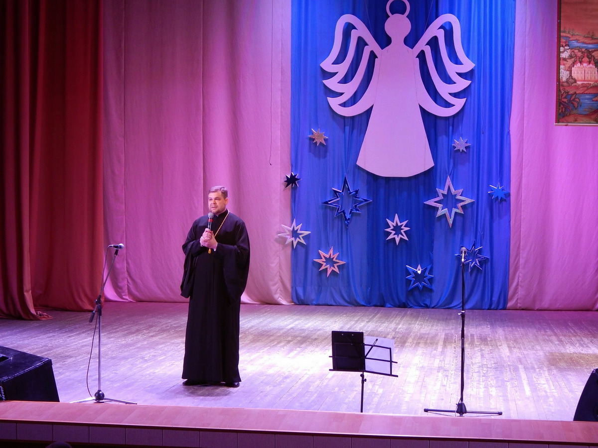 Отец Григорий поздравил всех зрителей и участников концерта с праздником Вознесения Господня и днём памяти святителя Николая Мирликийского. Священнослужитель отметил, что многие мероприятия Русской Православной Церкви в 2015 году проходят под знаком 1000-летия преставления святого равноапостольного князя Владимира. По словам протоиерея, деятельность святого князя способствовала формированию на Руси христианской культуры, христианской общественности, распространению Евангельской заповеди о любви. Также отец Григорий затронул тему 70-летия победы в Великой Отечественной войне, подчеркнул смысл подвига воинов, которые сражались за мир в каждом доме и за счастье в каждой семье.